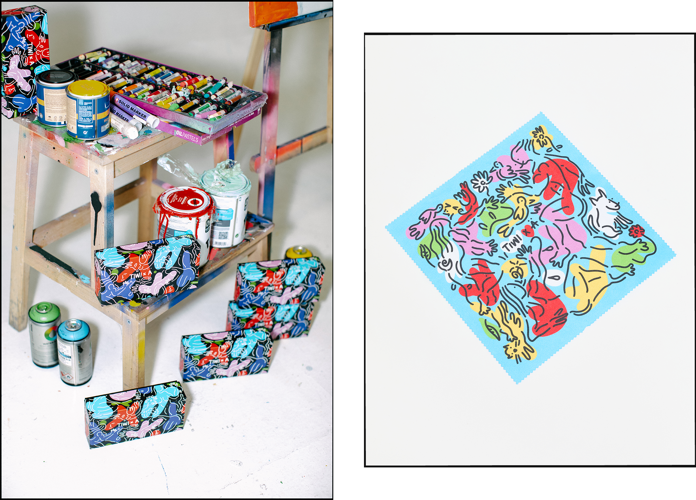 SU LENGUAJE PLÁSTICO, LLENO DE SÍMBOLOS Y COLOR, CONECTA DE FORMA NATURAL CON EL ADN DE TIWI, QUE DESDE SUS INICIOS APUESTA POR LA EXPERIMENTACIÓN Y LA AUTENTICIDAD CON COMBINACIONES DE COLOR ÚNICAS EN CADA COLECCIÓN.